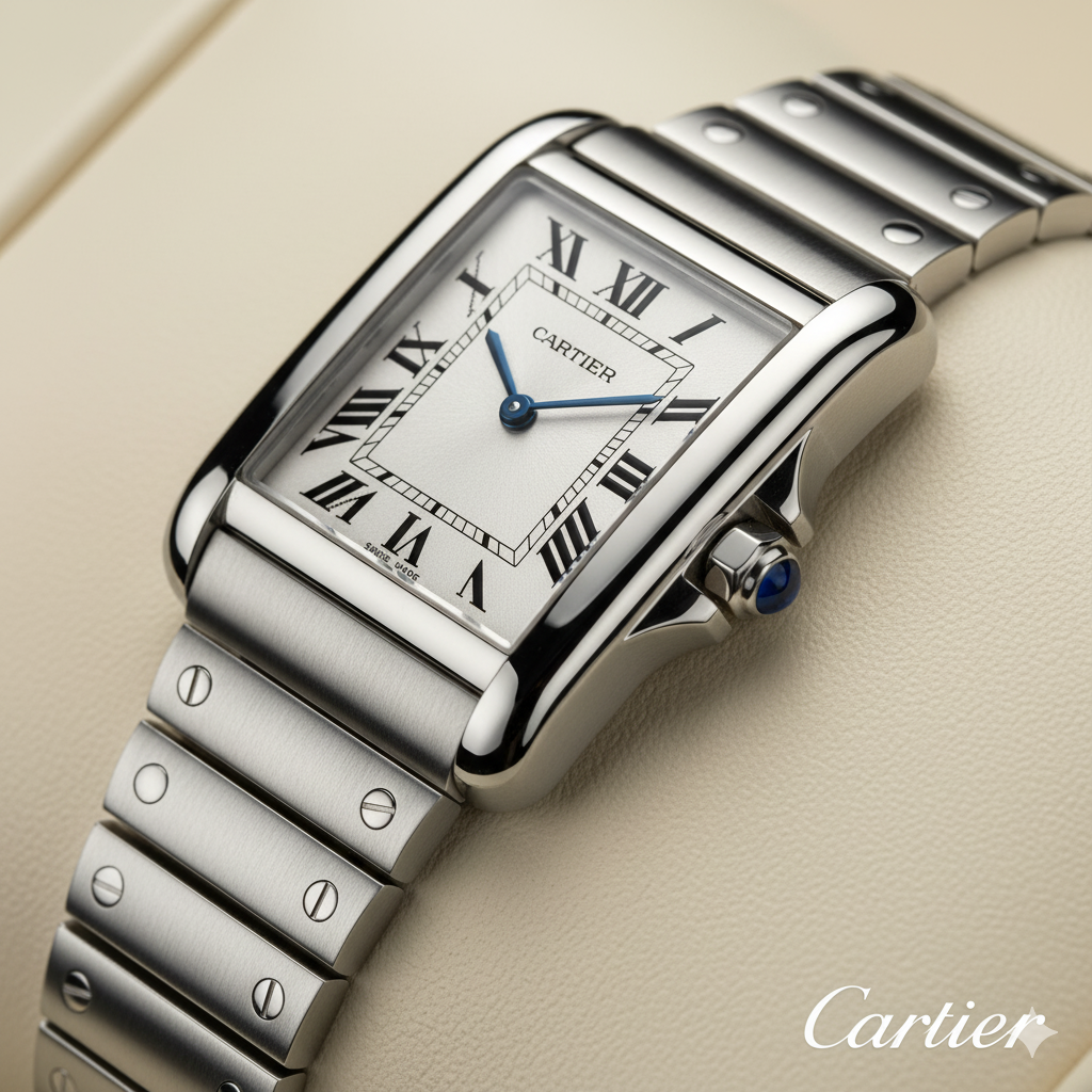 A rectangle with manners: brancards for shoulders, Roman numerals, rail‑track minutes, cabochon crown, leather that slides under a cuff. Sketched in 1917, released in 1919, the Tank has stayed composed through every decade since.